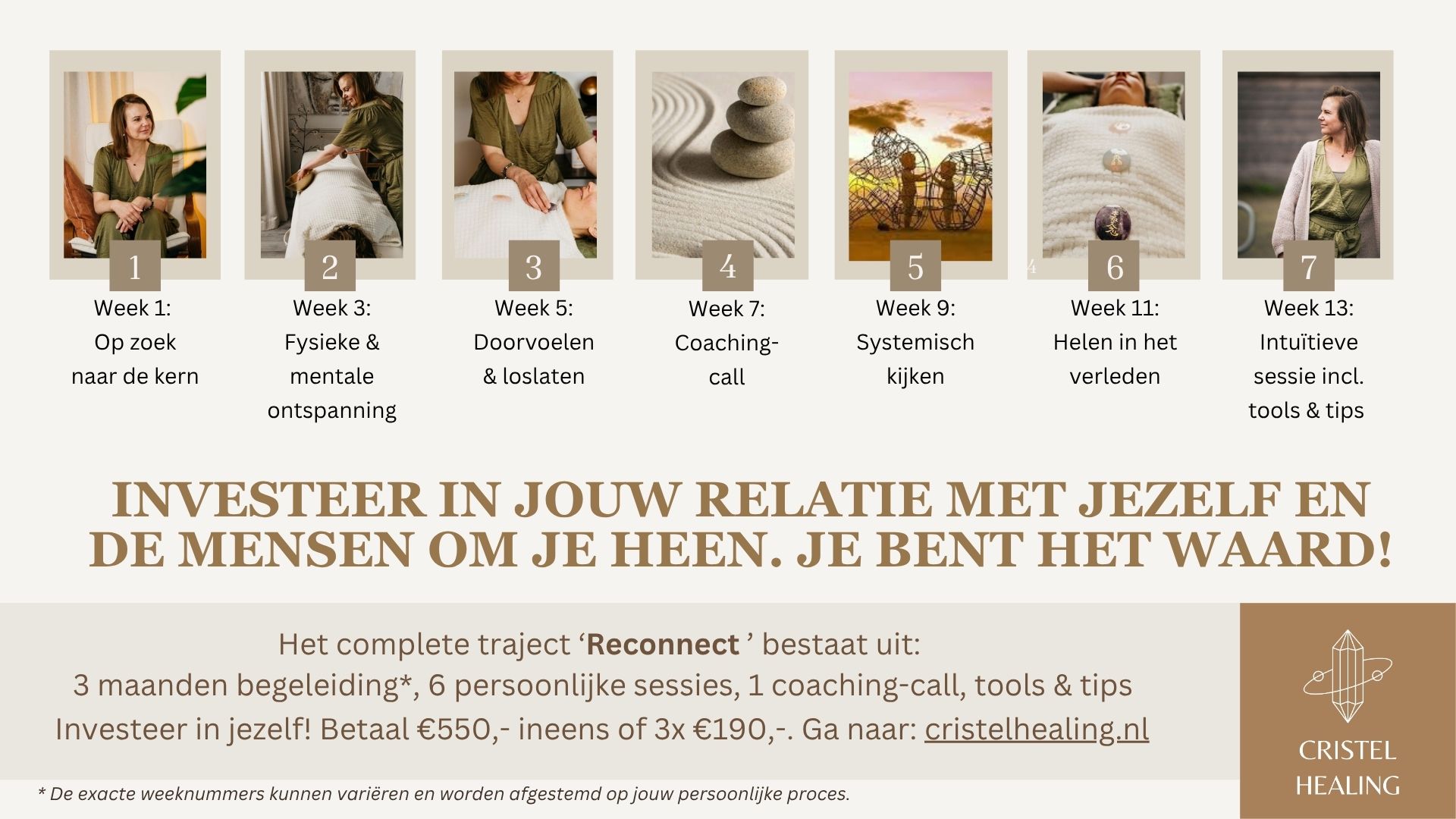 Het ‘Reconnect’ traject bevat 6 persoonlijke sessies, 1 coaching-call, persoonlijke tools & tips. Nu voor €550,-.